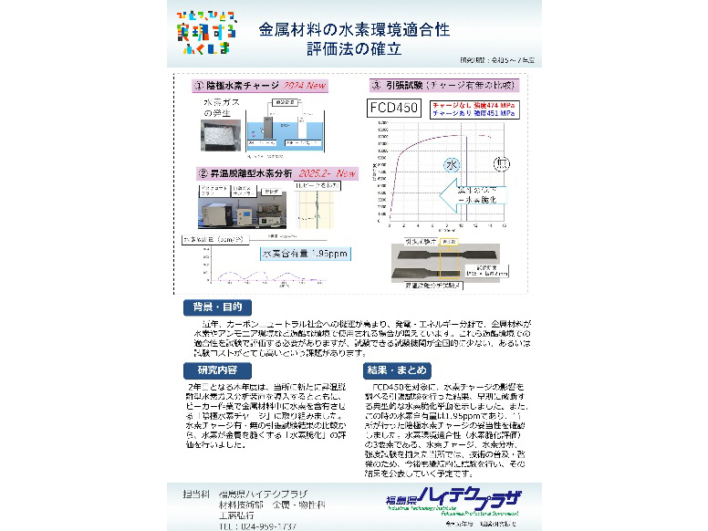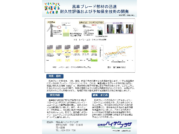 福島県ハイテクプラザ事業や、水素、風車ブレード関連の研究成果等のパネル及び成果品を展示予定です。
