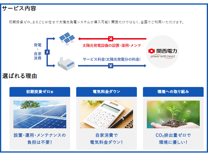 企業の脱炭素やコスト削減に向け、初期投資不要で導入いただける「太陽光オンサイトサービス」をご紹介します。導入時の工事から運用・メンテナンスまで、ワンストップでご提供します。「 脱炭素へ取り組みたい」「脱炭素に取り組みたいが何から始めれば良いかわからない」「電気料金を削減したい」方にオススメです。脱炭素・コスト削減に関するお悩みは、ぜひ関西電力にお気軽にご相談ください。