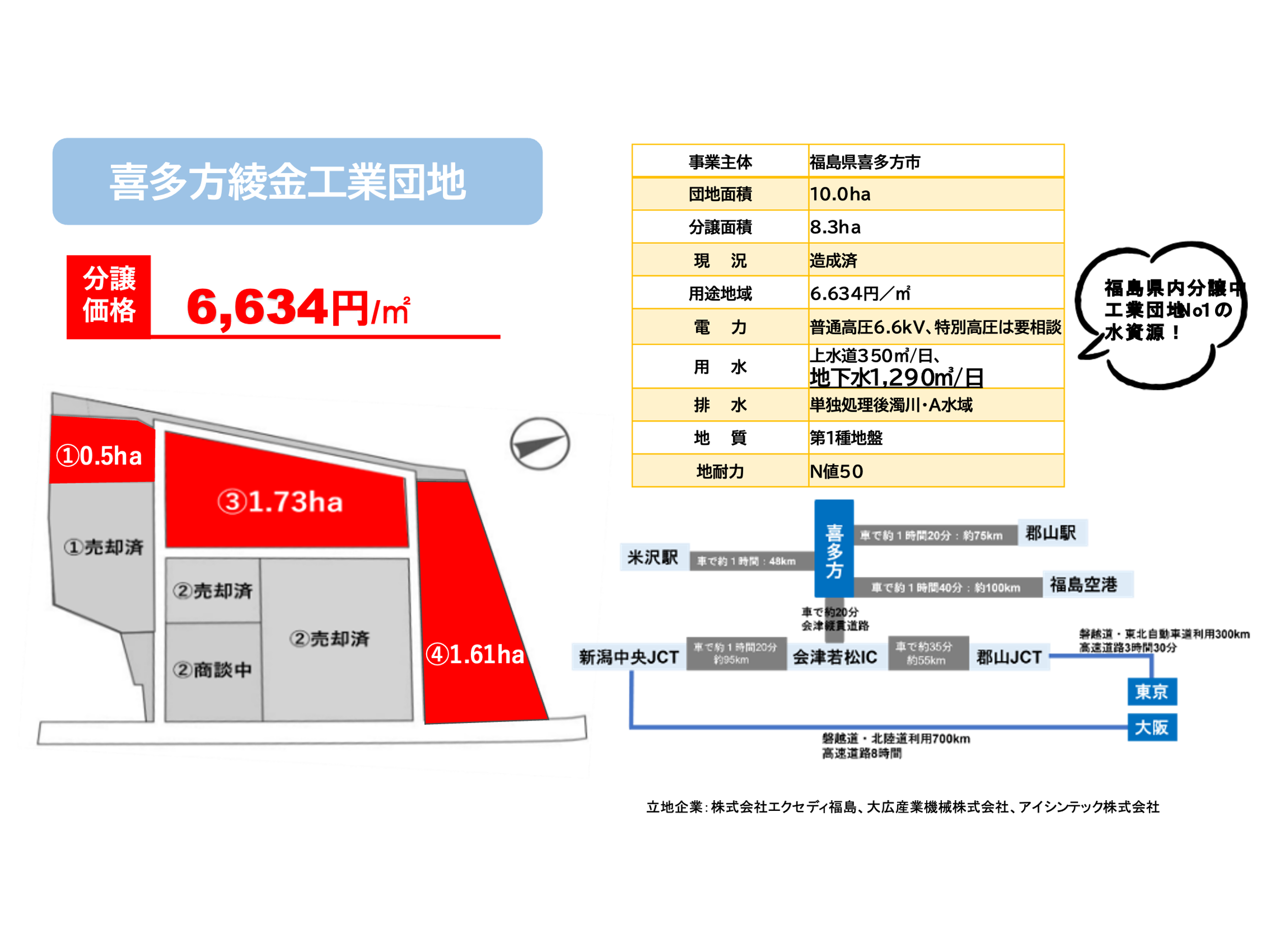飯豊山系の伏流水など水資源が豊富であり、水量は県内の分譲中の工業団地の中でNO1。強固な地盤を有し、地震や災害が少ない。磐越自動車道、会津縦貫北道路、大峠道路とアクセスは抜群。会津地方の企業、会津大学、福島大学、山形大学等との連携による地域産業の振興。次年度は市道豊川・慶徳線の全線開通によるアクセスの向上。